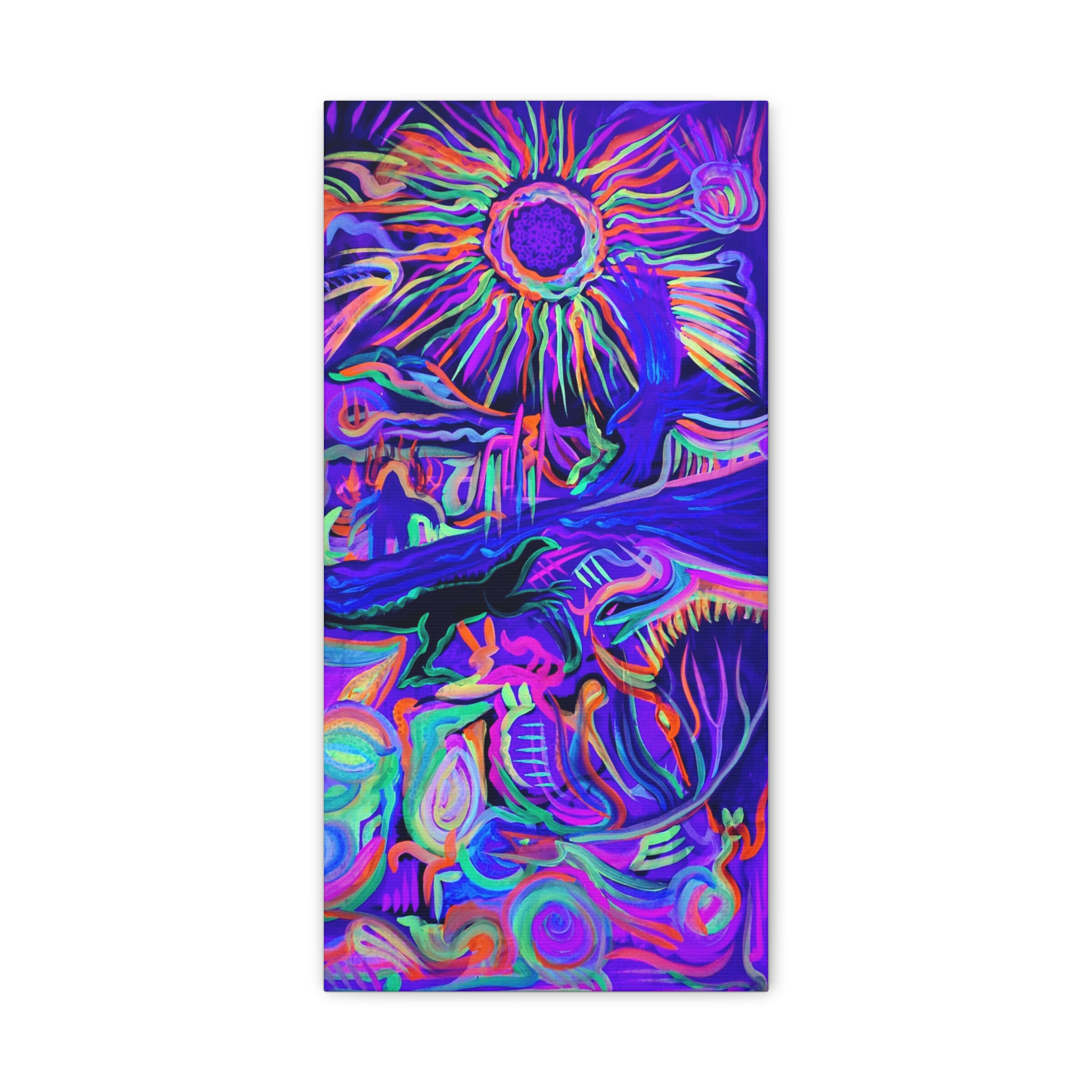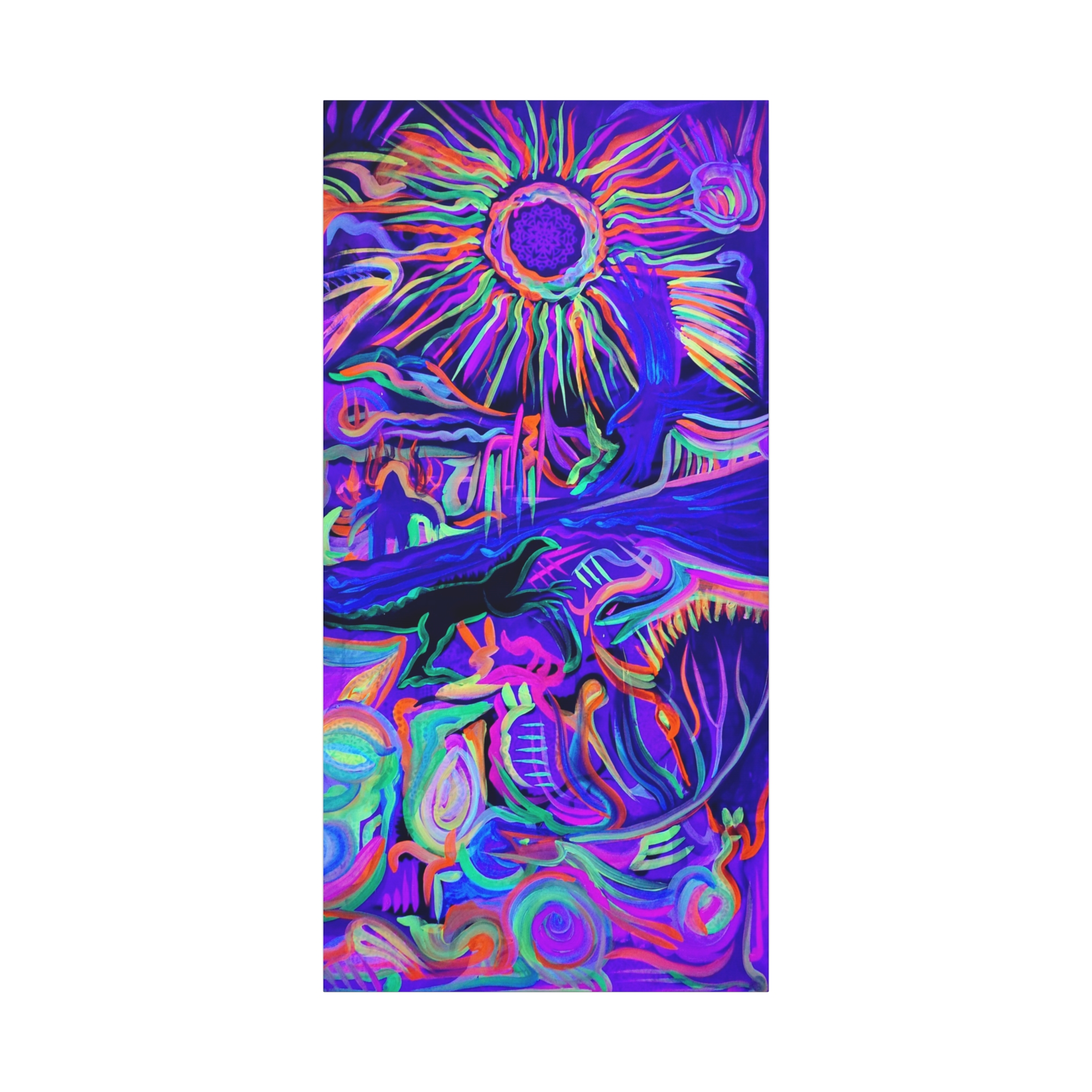 This piece was started at Standing Rock during the North Dakota Access Pipeline Protest. I took a trip to be a part of the historic movement and had two large canvases for people to paint on. While I was working on the larger of the two, a Native American spray paint artist from Texas asked if I had any spare canvas to paint on which I said he could start this one. He did part of the sun, the hands, and stenciled snowflake design throughout. Other Native Americans also contributed to the piece. It’s a representation of the protest and the importance of the life forces that sustain our life. There’s a river running through the middle of the piece and below it, you’ll see a small snake representing the pipeline and a dinosaur personifying the people who are there to ravage and rape the lands for greedy selfish gains. Above the river, you’ll see a Yeti on fire which represents the protestors and their fiery passion to protect their water. The blue hawk is connecting the sun and water together which both are needed to live life. The hands represent our imprint on the World and that we must make wise decisions to protect our land and lives. Finally bottom right there’s a buffalo and elk which represents the majestic nature and regal beauty of existence. This is a highly vibrational piece with explosive color and expression of nature that would look good in any home!